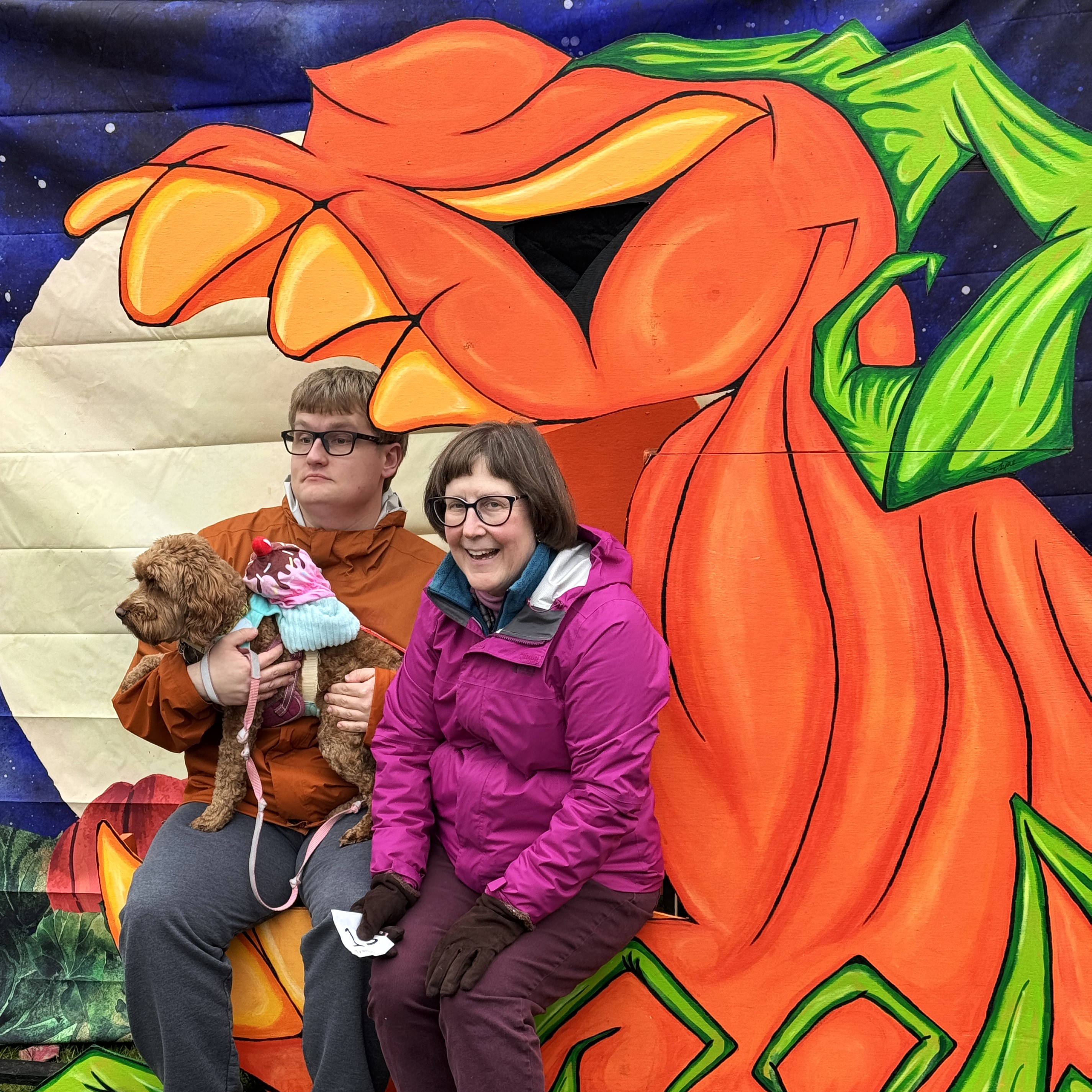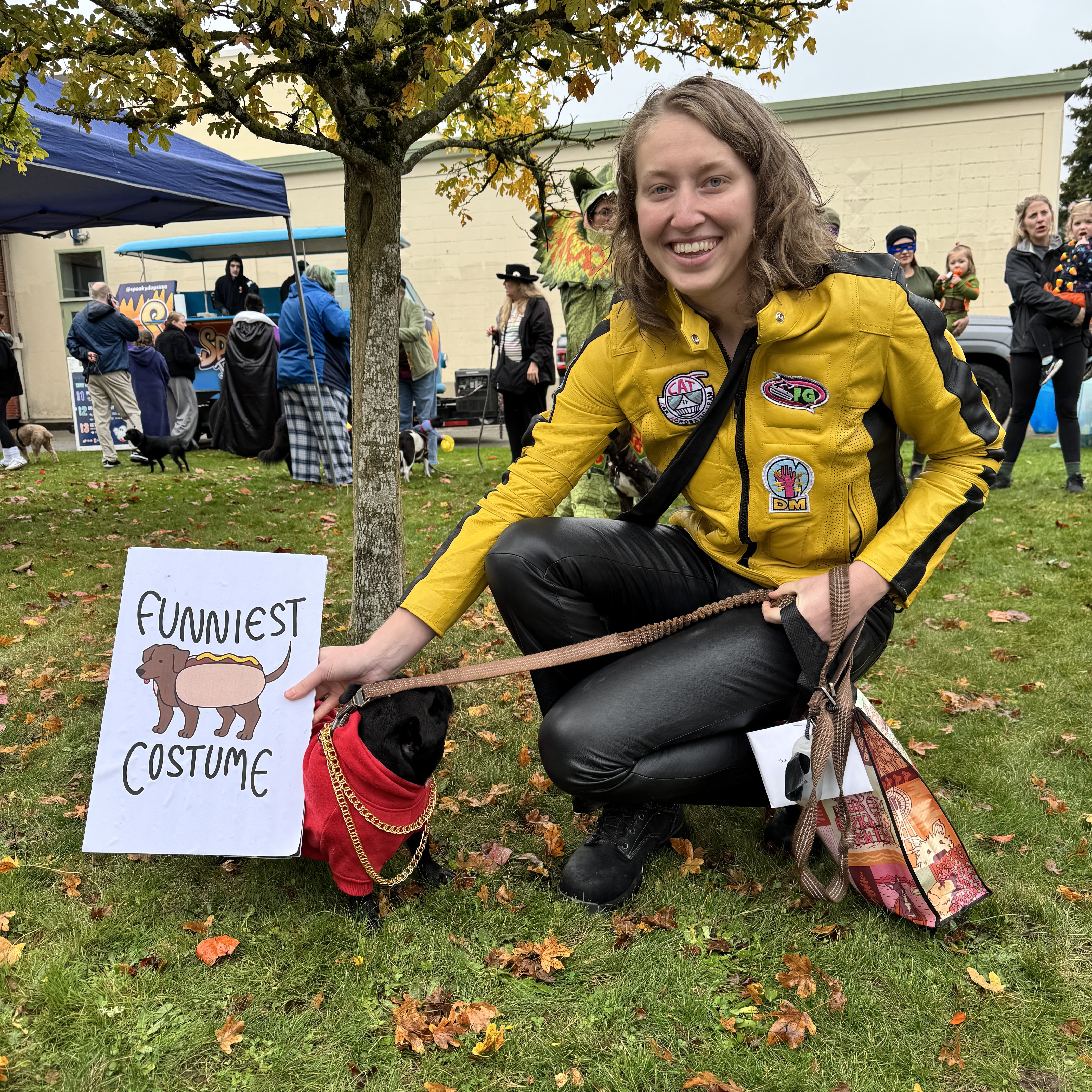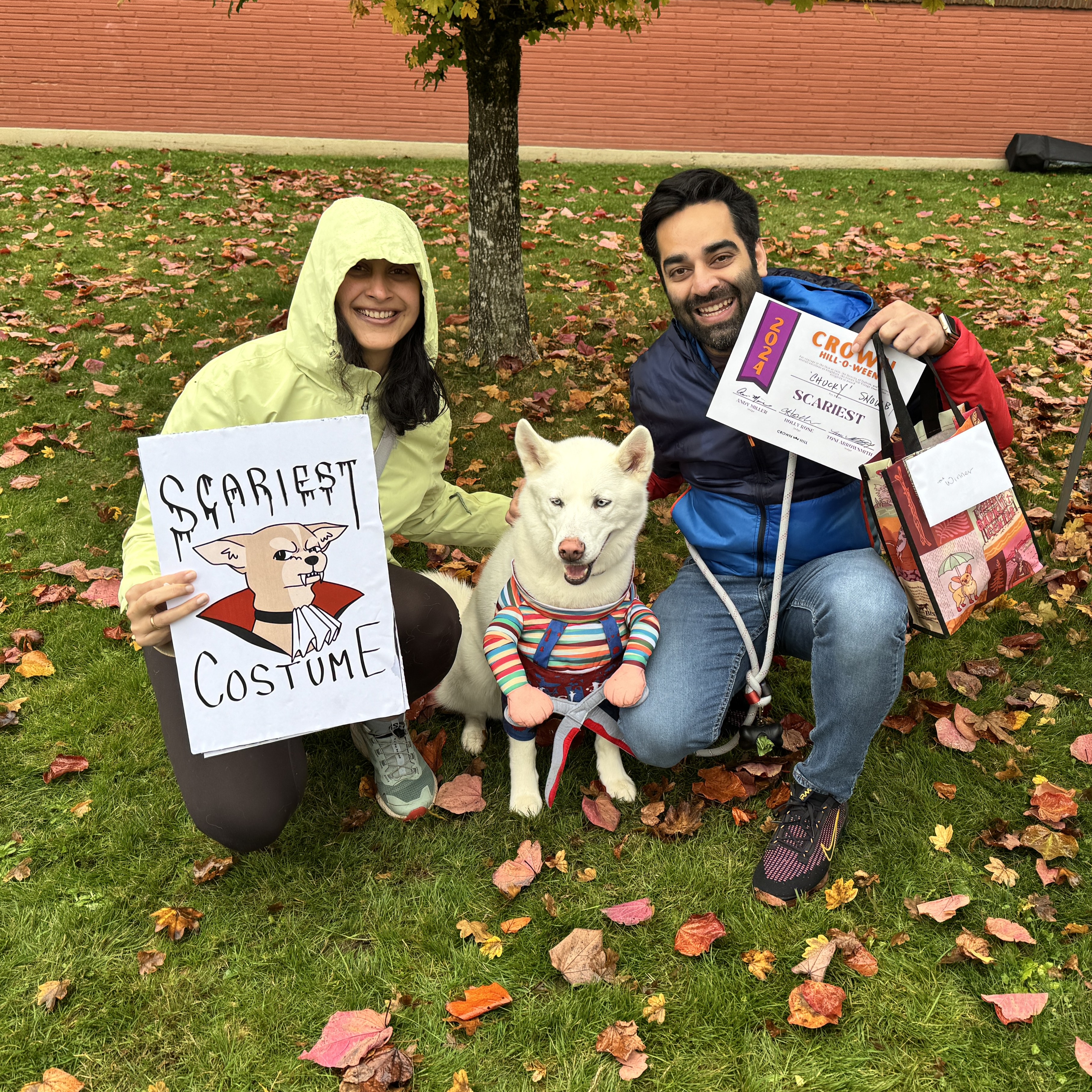 The 2024 Crown Hill-O-Ween competitors were in rare form on Saturday, and no rain could spoil our parade! One rabbit, one cat, and many, many dogs, along with their humans, turned out and they really brought the flair! These pets used all of their considerable patience and goodwill to strut their stuff. Our honorable judges had a tough time choosing among the splendid array of looks on the runway.